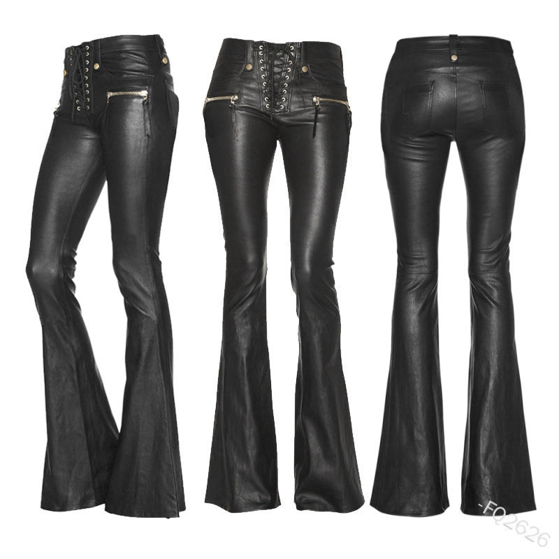 ZASUWA Female Faux Leather Zipper Lace-up Flare Leggings