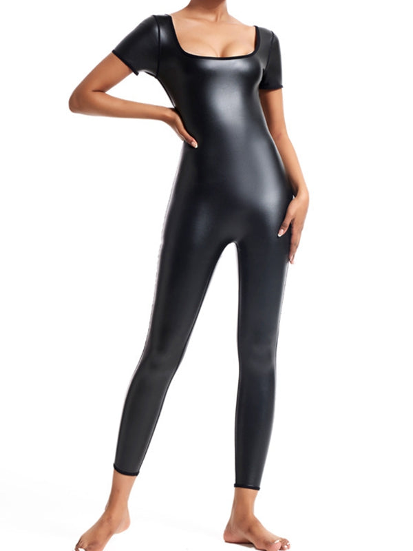 ZASUWA Female Faux Leather U Collar Short Sleeves Jumpsuits