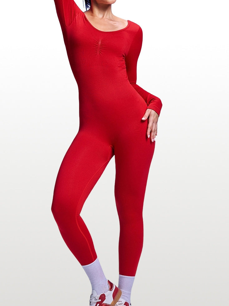 ZASUWA Female Red Backless Ribbed Deep V Back Long Sleeves Jumpsuit