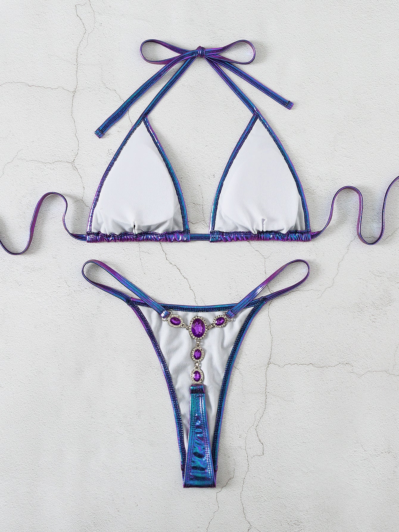 ZASUWA Female Glossy Faux Leather Front Folds Crystal T-back Bikini Set