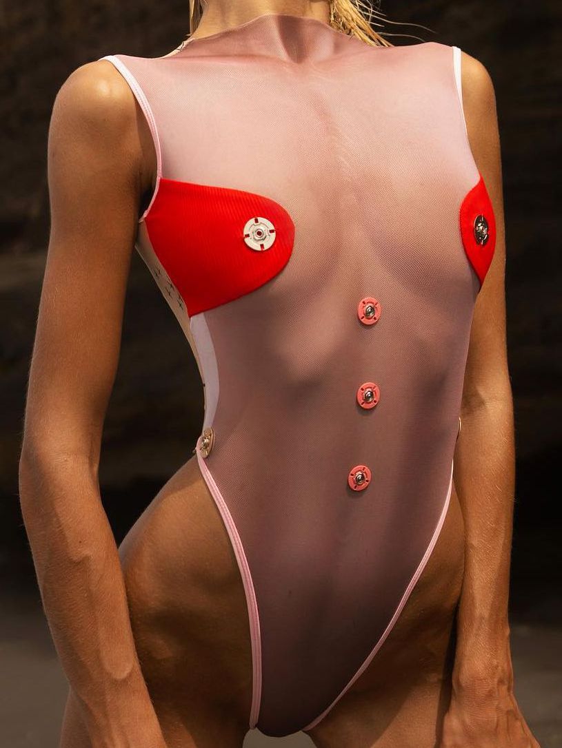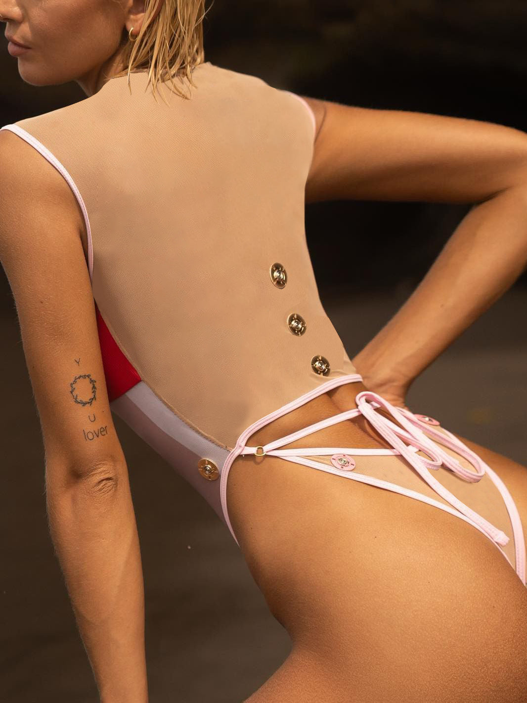 ❤ZASUWA Female Contrast Color Mesh Buttons Print Lace-up Hollow Out One Piece