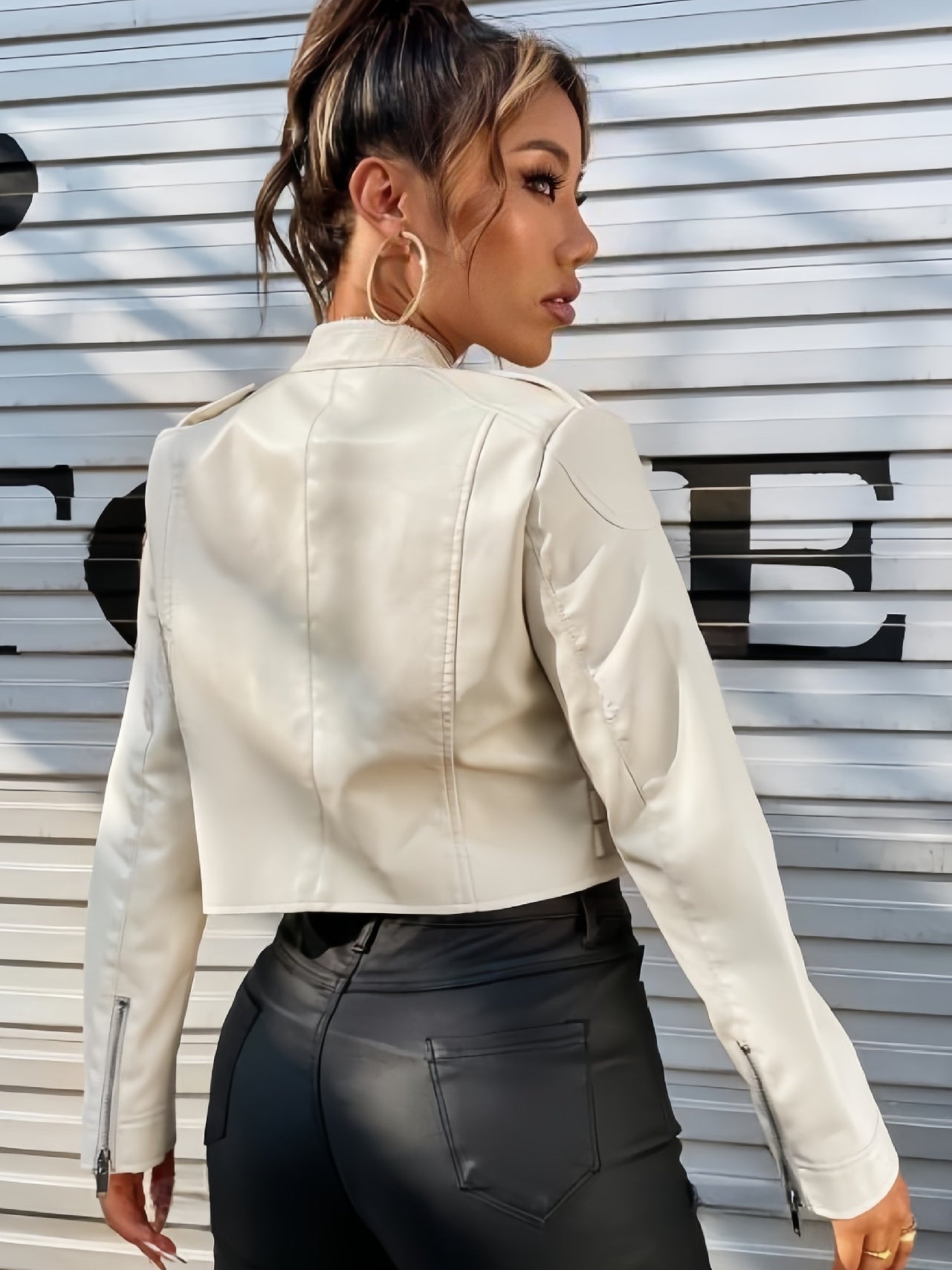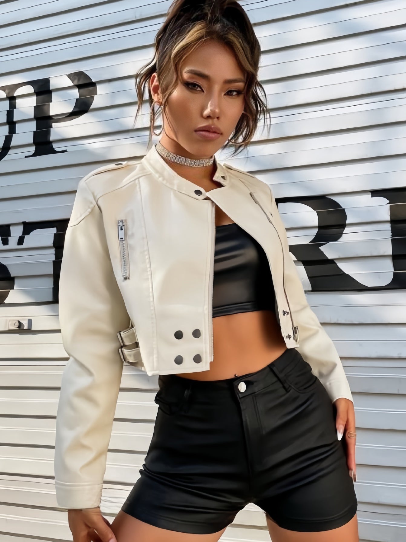ZASUWA Female Zipper PU With Metal Buttons Faux Leather Jackets
