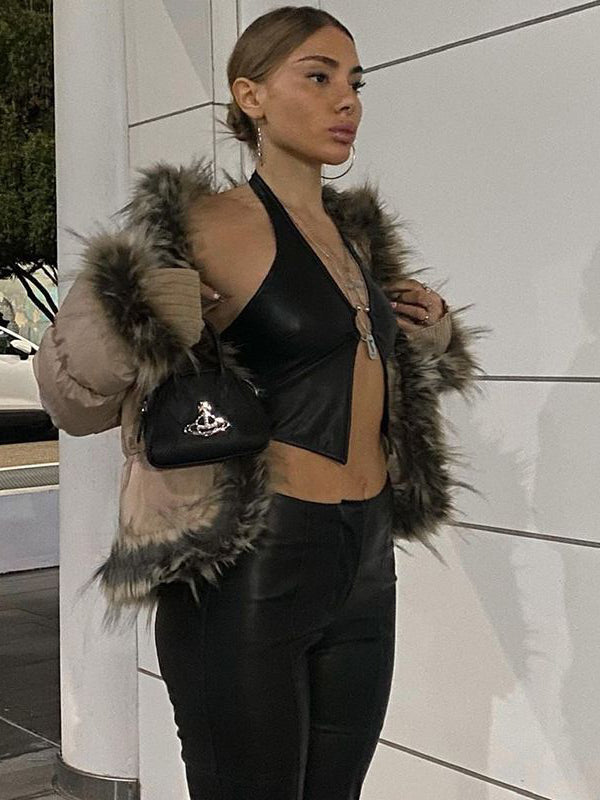 ZASUWA Female Halter Faux Leather Backless with Metal Ring Hollow Out Corset Tank